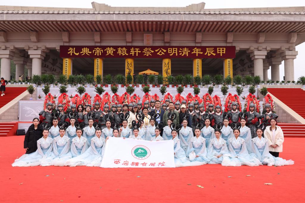本网讯 寻根祭祖黄帝陵,同心共圆中国梦。4月4日,备受华夏儿女瞩目的甲辰年清明公祭轩辕黄帝典礼在黄陵县桥山轩辕殿前广场隆重举行。我校艺术学院52余名学生承担了公祭典礼“乐舞告祭”中干戚舞段、云翘舞段的演出任务。