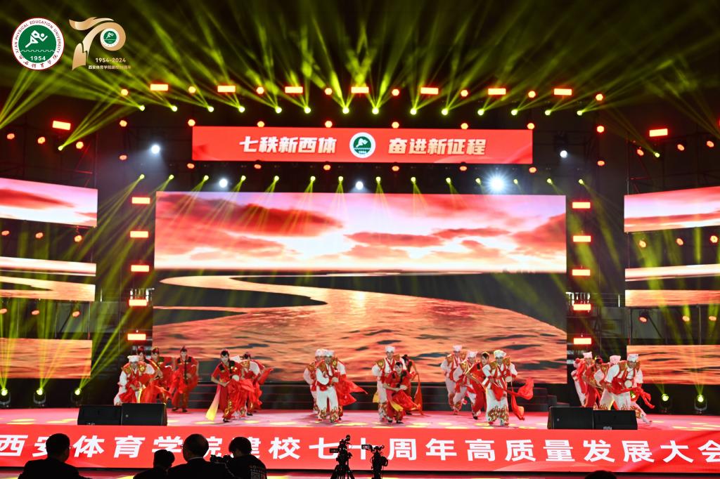 参会领导和嘉宾共同观看了学校教学成果展演。师生为各位来宾和校友举办了一场精彩纷呈的“体育+文化+艺术”展演。本次展演共分为五个篇章:“精心筹建”“艰难初创”“持续发展”“加速嬗变”“崛起辉煌”。展演由《龙腾鼓舞》这一具有陕西特色的腰鼓表演拉开帷幕,通过安塞腰鼓龙腾鼓舞之姿回首七秩风华。将体育与中华优秀传统文化高度结合的舞蹈表演《薪火》《秦·怀》《蹴鞠仕女》,体现了西体深厚的文化艺术底蕴。武术表演《舞动乾坤》、操舞组合《奋斗青春》,激扬奋进、酣畅淋漓。最后,以西体老、中、青三代师生代表,百人齐唱《光荣与梦想之歌》,承载着代代西体人对于母校建设和国家体育、教育事业发展的美好愿景。