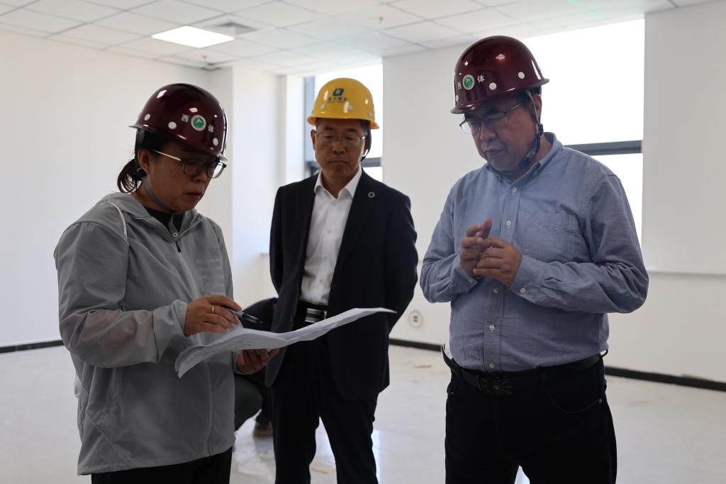 教学综合楼庄严大气、宽敞明亮,一行人赞不绝口。李富生指出,新校区不仅是学校硬件设施的升级,承载着师生的期望与梦想,更是实现强校目标的重要平台。为做好主体搬迁,确保平稳有序过渡,李富生强调,一要优化功能布局与资源配置。进一步优化空间布局,合理规划资源利用,提高资源使用效率,实现各类教学、科研、办公设施的配置合理、高效。要关注教室、实验室、会议室、图书馆等重点区域的设计和使用需求,确保能够满足未来学习工作实际需要。二要坚持简洁高效方便办公原则。在功能分区和办公区域划分上,通过设置集中办公区域、增加公共交流空间、实施智能化管理等手段,提高行政效率,加强各部门沟通协调,营造更加高效、舒适的办公环境。三要强化安全管理与环保意识。施工接近尾声,更要加强安全管理,确保工程进度和施工安全。在办公设施采购中要提高环保意识,让师生拥有安全、环保、绿色、可持续的工作学习环境。
