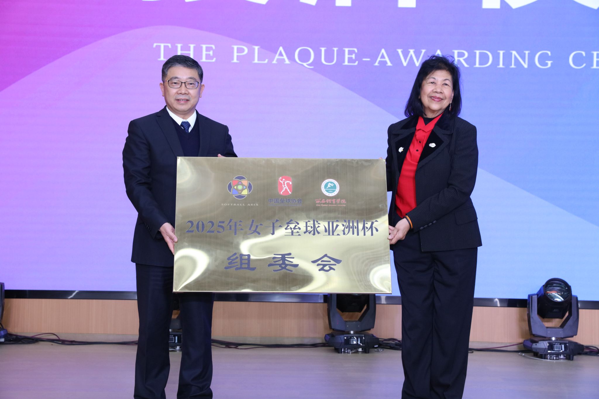 亚洲垒球联合会秘书长莎丽代表组委会向我校党委书记刘子实授牌