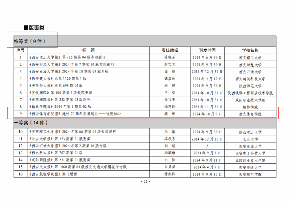 本网讯 日前,陕西高校校报研究会公布了2024年度“陕西高校新闻奖”评选结果,我校2件作品获奖。其中《〈久久不卡区报〉建校七十周年发展巡礼——追溯初心》获得版面类特等奖,顾彬、田芊伊、王锦婷撰写的《七秩新西体 奋进新征程——我校举行建校七十周年高质量发展大会》获得通讯类二等奖。